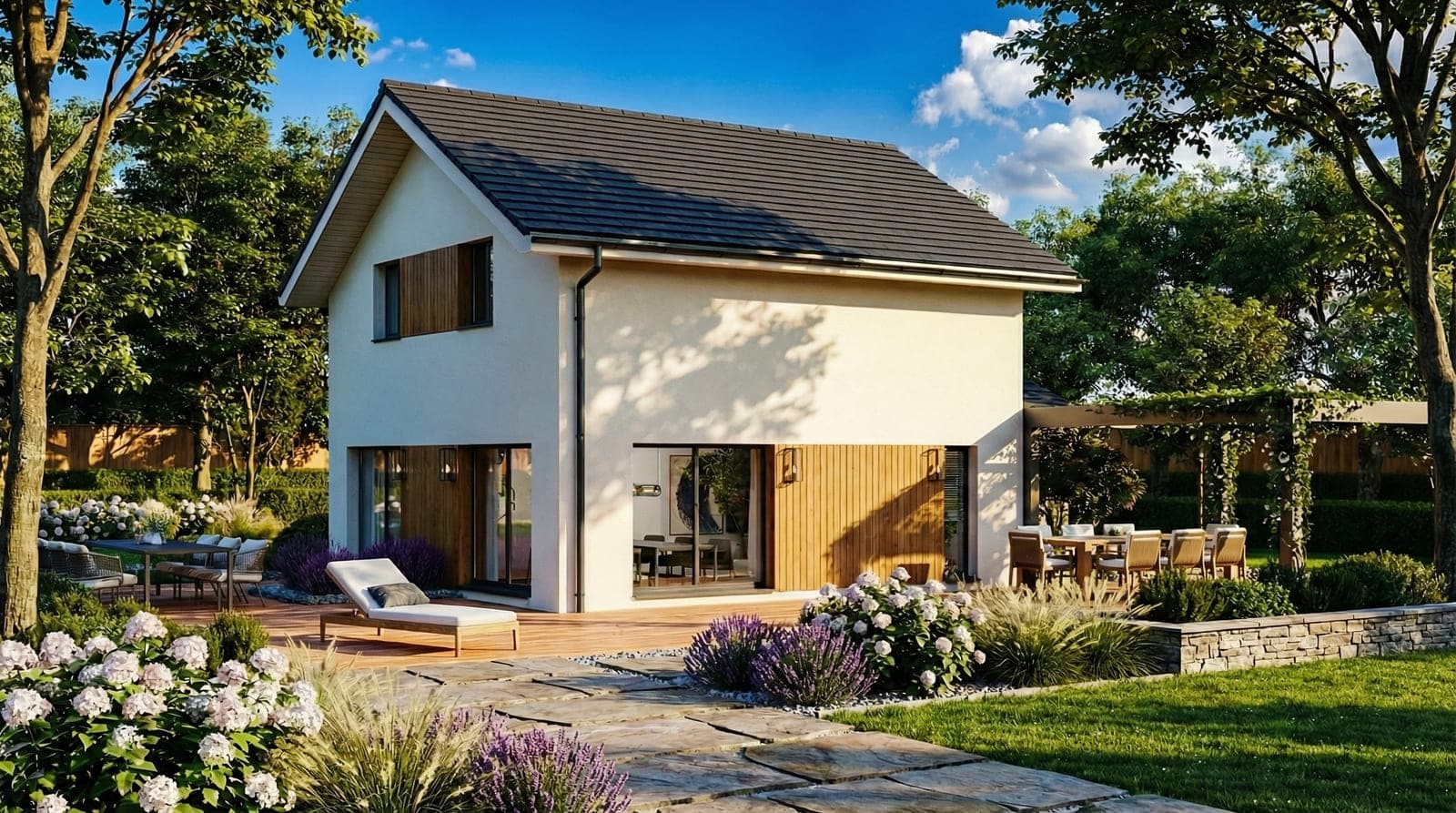 Pensée pour s’adapter à votre mode de vie, LYS propose plusieurs déclinaisons, avec des options comme un habillage bois ou un abri voiture. Elle intègre une pompe à chaleur, un plancher chauffant basse température, des volets motorisés, et répond à la norme RE2020. Avec ses finitions soignées et son style affirmé, LYS est une maison durable, confortable et résolument moderne.