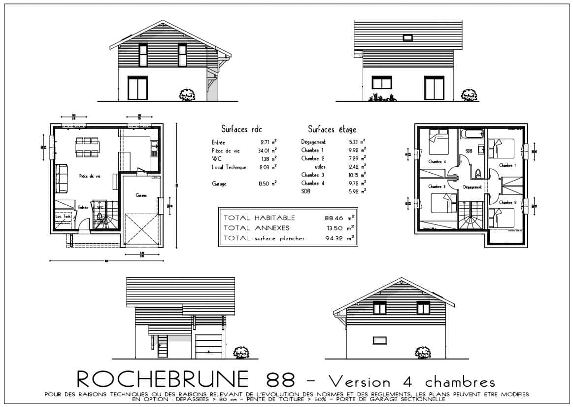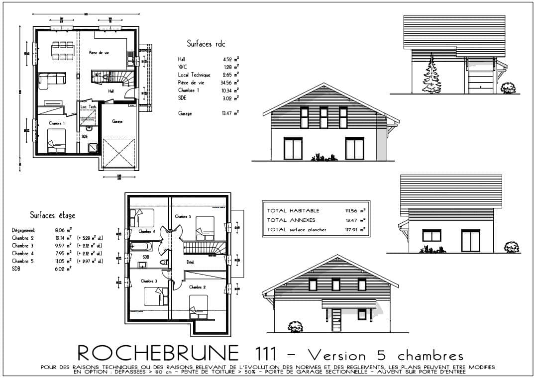 Ce beau modèle compact prévu pour les vallées alpines mérite son nom très romanesque. C’est une maison très élégante que vous serez fiers d’ériger dans son écrin montagnard. Dotée d’un garage intégré et de 4 ou 5 chambres équipées de placards, la Rochebrune offre de belles dimensions allant de 88 m² à 111 m², avec un étage sous combles. Le rez-de-chaussée, entièrement dédié à la pièce de vie, offre un espace commun vaste et agréable. C’est une maison parfaitement adaptée pour les familles, qui jouiront d’espaces confortables. La version 88m2 vous offre la possibilité de réaliser cette construction sur sous-sol.