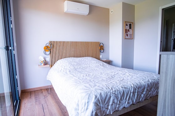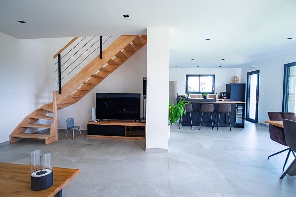 Comme toutes nos réalisations, cette maison respecte la réglementation thermique RE 2020. Le chauffage par plancher chauffant, alimenté par pompe à chaleur, garantit un confort optimal et une haute efficacité énergétique.